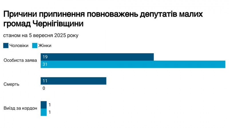 "Проте визначити справжні мотиви складно. Як мінімум 11 випадків пов’язані з призначенням на посади в органах місцевого самоврядування (наприклад, старости). 11 випадків припадає на смерть депутата, причому, це виключно чоловіки. Як мінімум троє депутатів загинули на війні, як нам повідомили в особистій комунікації з місцевими радами. Ще два випадки пояснюються виїздом депутата за кордон", — повідомляє ГМ "Опора".