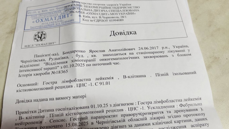 Тоді стан хлопчика вдалося стабілізувати. Рік він лікувався і ще два роки був на підтримувальній терапії. Восени 2025-го стався рецидив.