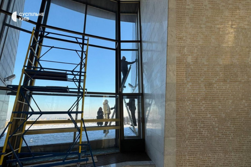 Національний музей історії України у Другій світовій війні (Музей війни) продовжує працювати, попри пошкодження внаслідок атаки РФ у ніч на 3 лютого. Вибуховою хвилею вибито скло у залі слави музею біля підніжжя монумента "Батьківщина-мати".