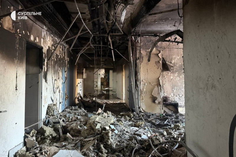 Наслідки атаки Києва 5 січня 2026 року. Суспільне Новини/Анна Железняк"Влучання сталося на рівні другого поверху чотирьохповерхової будівлі медичного закладу. В медичному закладі працювало стаціонарне відділення, тобто були люди всередині. Загалом пожежу на площі 20 квадратних метрів локалізували о 3:34 і о 3:44 за 10 хвилин вже ліквідували", — розповів Суспільному речник ДСНС Павло Петров.