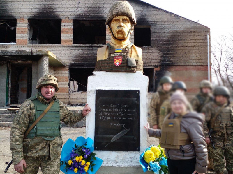 Микола Дорош з побратимами під час служби на війні, біля пам’ятника Шевченка