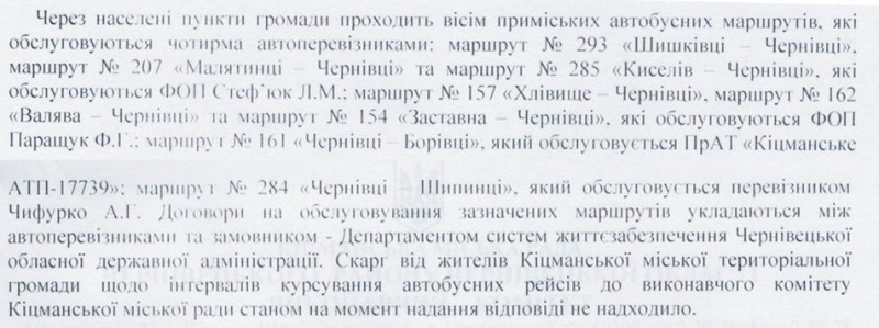 У Сторожинецькій громаді не відповіли, чи усі населені пункти сполучені громадським транспортом. Водночас проінформували, що громада має укладений договір з приватним підприємством "Підгір'я-Авто", який обслуговує маршрути: