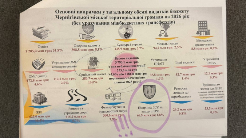 Основні напрямки видатків у першому варіанті бюджету Чернігова на 2026 рік. Дмитро Брижинський