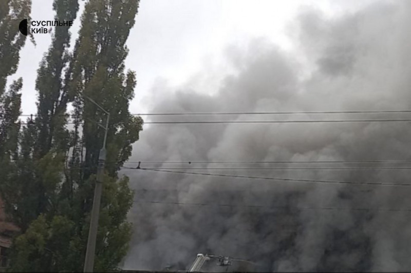 Дим від пожежі, яка виникла внаслідок атаки РФ у нежитловій будівлі у Дарницькому районі. Київ, 25 жовтня 2025 року. Суспільне Новини/Людмила Тумачова
