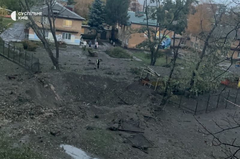 У Дніпровському районі ракета влучила у землю поруч з житловими будинками та дитячим садком — на місці влучання утворилася велика вирва, передає кореспондентка Суспільного.