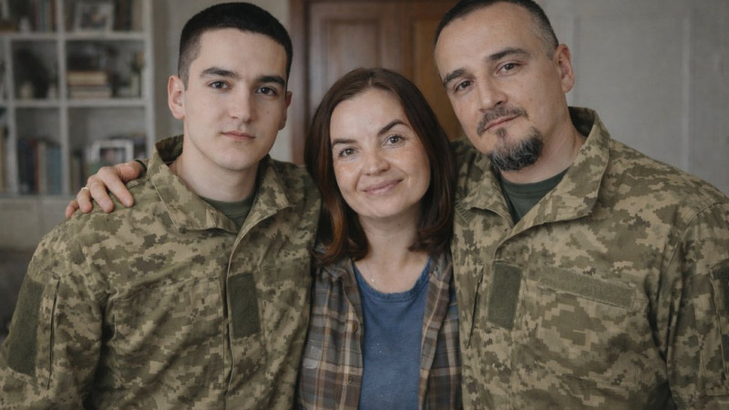 Загиблий військовослужбовець ЗСУ Леонід Данілкін разом із сином та дружиною Тетяною. Тетяна Данілкіна