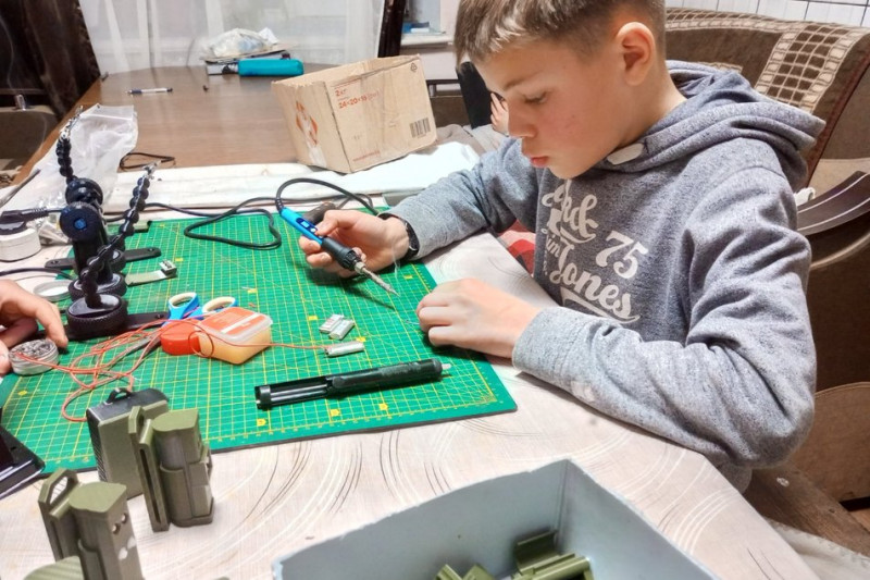 "Я все роблю сам. Перший ліхтарик не світився, довелося переробляти — плюс із мінусом переплутав. Раніше давали легші схеми, тепер уже складніші. Більше треба паяти й більше думати", — розповів 13-річний Кирило Герасименко.
