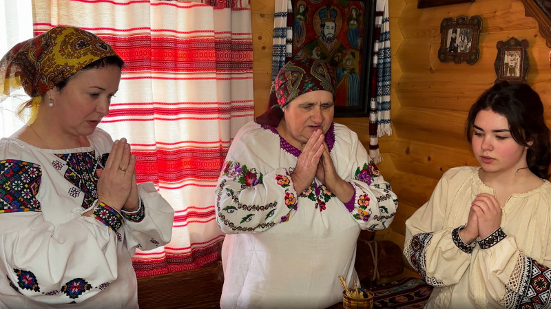 Лілія разом зі свекрухою та донькою моляться перед початком розпису писанок. Суспільне Чернівці/Анатолій Слижук