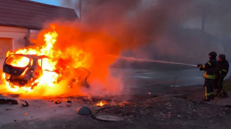 Пожежники гасять авто, яке зайнялося внаслідок атаки РФ, Дніпропетровщина, 22 березня 2026 року. Олександр Ганжа/Telegram