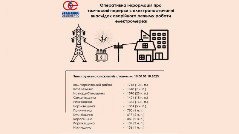 Перелік знеструмлених територій на Чернігівщині. ФОТО: АТ «Чернігівобленерго»