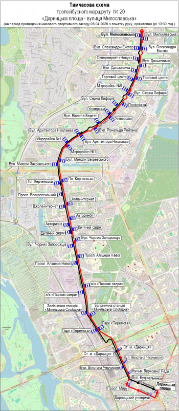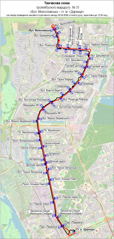 Схема руху тролейбусу № 31 – від вул. Милославської до ст. м. «Дарниця». КМДА