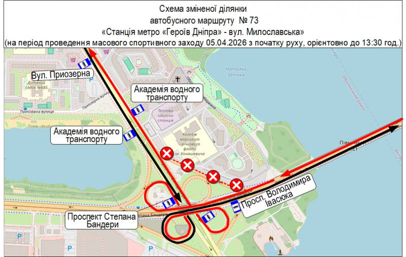 Автобус № 73 – у напрямку до ст. м. "Героїв Дніпра" від вул. Милославської до просп. Степана Бандери за власним маршрутом, далі – просп. Володимира Івасюка – просп. Степана Бандери – просп. Володимира Івасюка, далі – за власним маршрутом.