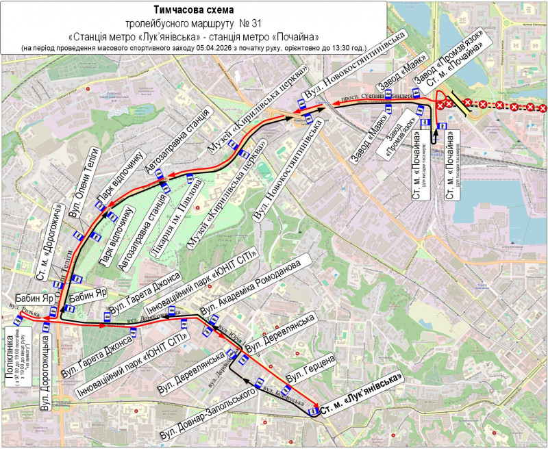Схема руху тролейбусу № 31 від ст. м. «Лук’янівська» до ст. м. «Почайна». КМДА