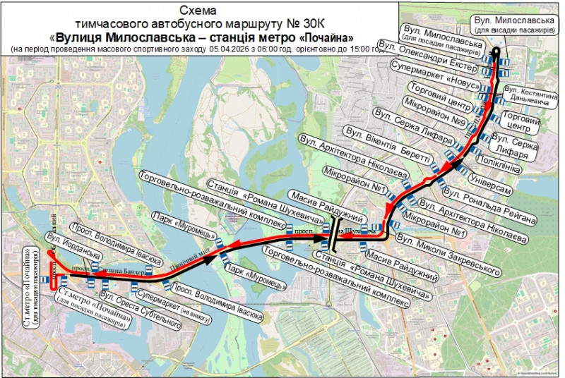 Також організують тимчасовий автобус № 30-К "Вул. Милославська – станція метро "Почайна", який курсуватиме таким чином: просп. Червоної Калини (від вул. Милославської) – просп. Романа Шухевича – Північний міст – просп. Степана Бандери – вул. Богатирська – просп. Оболонський до ст. м. "Почайна".