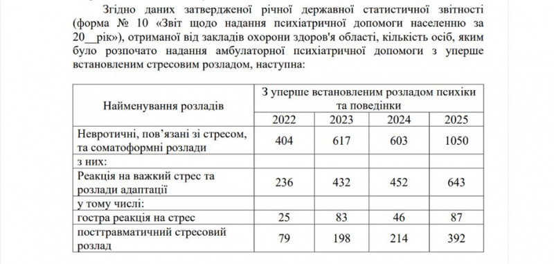 Кількість людей, в яких вперше в області діагностували стресові розлади. Скріншот відповіді на запит“Збільшення кількості розладів можливе тому, що війна триває вже четвертий рік, і хронічний стрес накопичується. Якщо на початку багато хто мобілізував внутрішні ресурси, то з часом вони виснажуються. Крім того, люди стали частіше звертатися по допомогу й більше говорити про свій стан, тож ми просто краще бачимо проблему, яка раніше могла залишатися непоміченою", — додає психологиня.