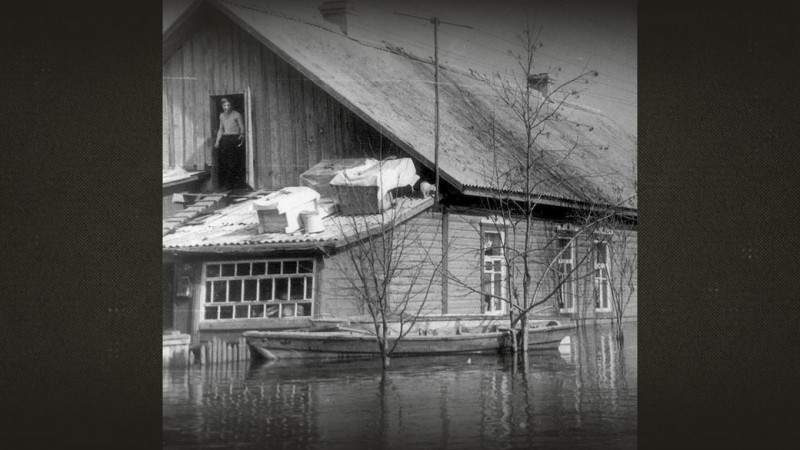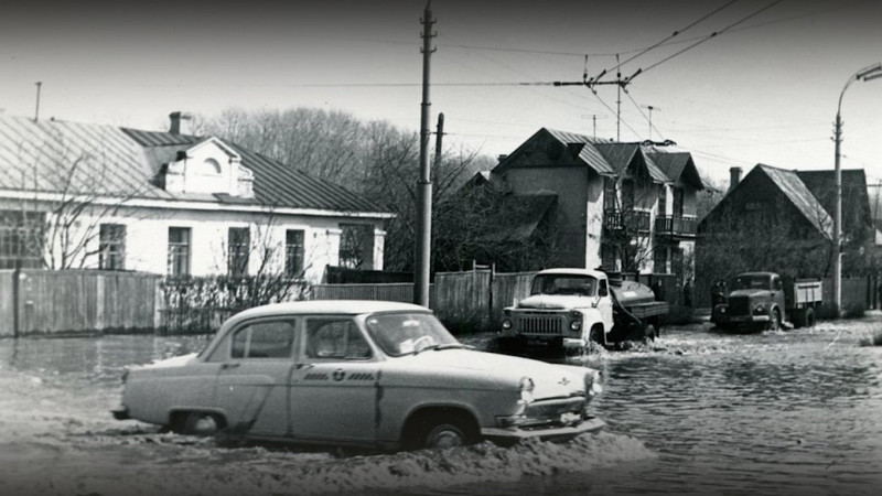 Човен на затопленій вулиці у Чернігові у 1970 році. Анатолій Яровед"У 1970-му вся вулиця була зайнята військовими БТРами, вони плавали вулицею. Майже у кожного був човен. Тоді дали човни. Дало «Хімволокно» свої човни. Там же в них база була за Десною".
