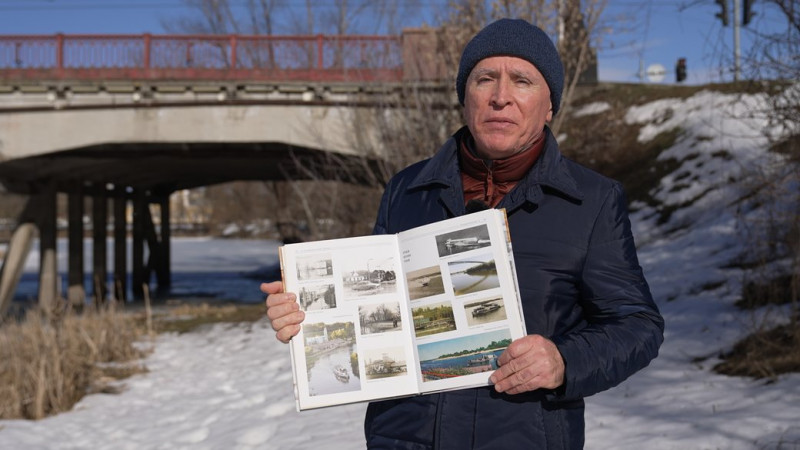 Сергій Леп’явко показує рівень води в районі Красного мосту у 2026 році. Суспільне Чернігів"На Красному мосту у тролейбусі нижня сходинка була затоплена. Це я пам’ятаю. І щоб зайти до тролейбуса, треба було стрибати. Було дуже багато води", — зазначає Василь.