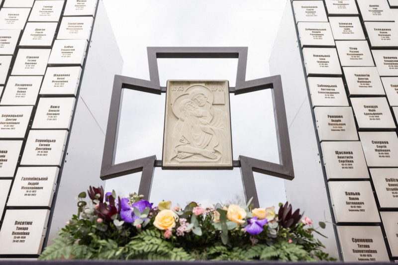 Меморіал пам’яті убитих РФ українців, розташований на території церкви Святого апостола Андрія Первозваного та всіх святих ПЦУ у Бучі. Telegram/Володимир Зеленський