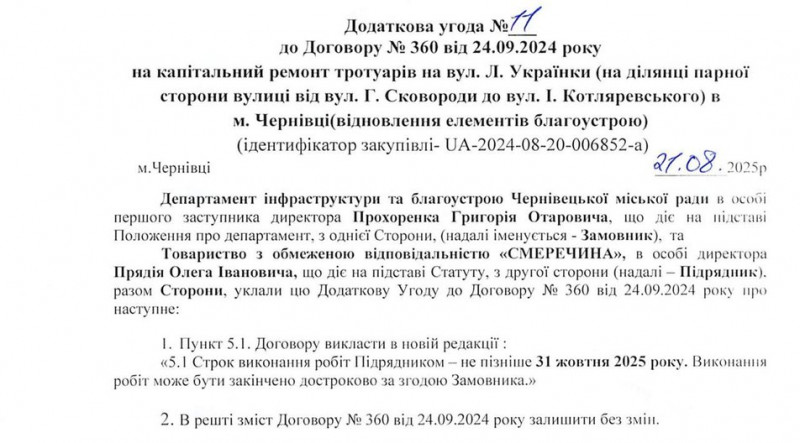 Роботи мали виконати до 5 грудня 2024 року, однак згодом уклали 11 додаткових угод. Згідно з останньою, завершити роботи на ділянці мають до 31 жовтня цього року.