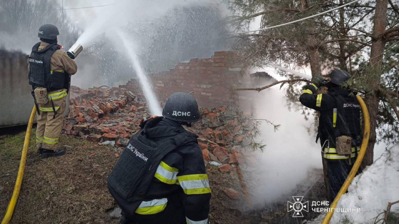 Пожежники гасять пожежу, яка виникла внаслідок атаки РФ на Чернігівщині 28 січня 2026 року. Головне управління ДСНС у Чернігівській області