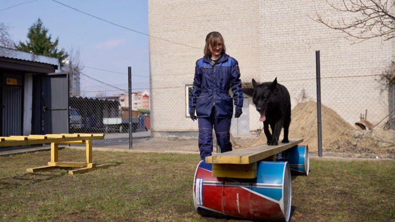 Тренують службових собак що дня, розповіла кінологиня. Роблять це на території пожежної частини. Також із Фіоною та Жуком гуляють містом, аби вони були соціалізованими.