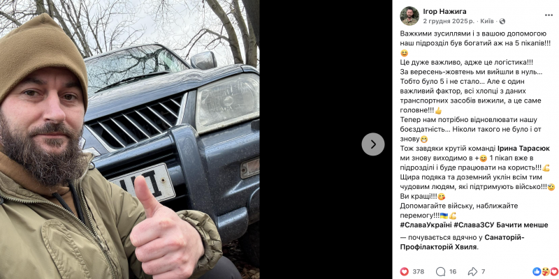 Ігор Нажига з придбаним волонтерами авто, допис зі сторінки. Ігор Нажига