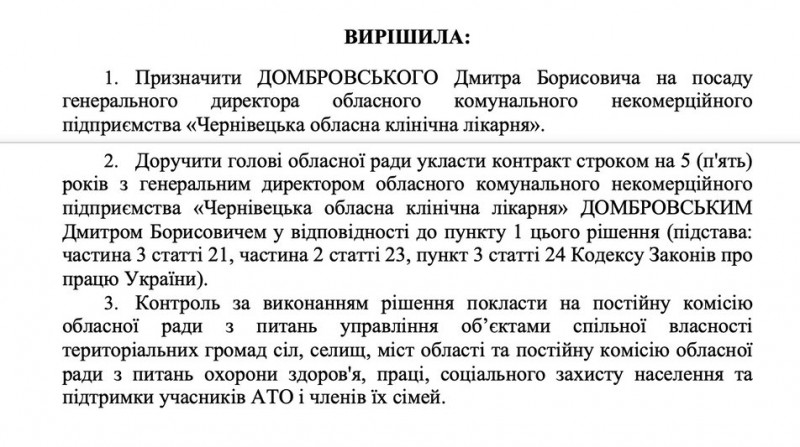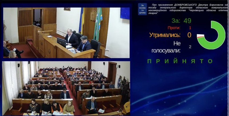 Дмитра Домбровського призначили гендиректором обласної клінічної лікарні у Чернівцях. Питання про його призначення внесли у порядок денний за рішенням суду. "За" проголосували 49 депутатів на сесії обласної ради.