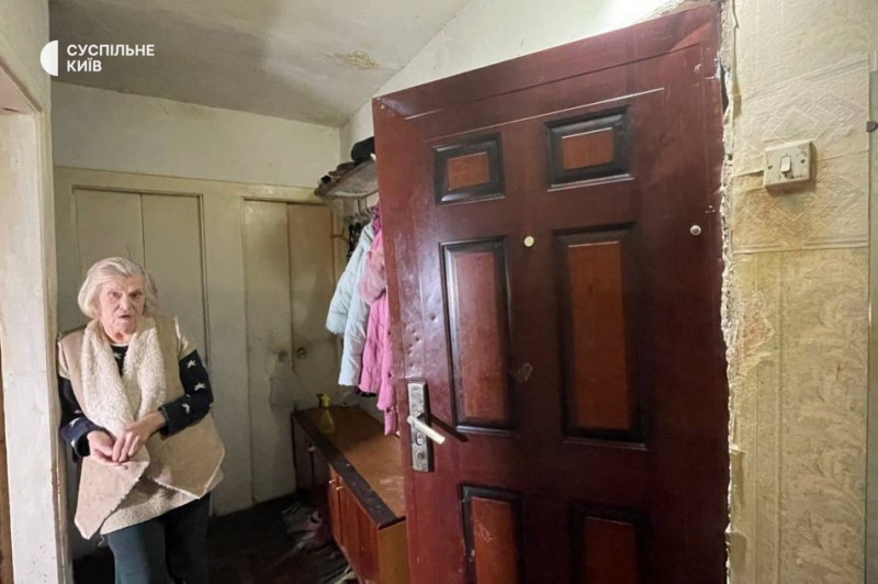 Тетяна — мешканка будинку у Святошинському районі Києва, який був пошкоджений під час атаки РФ 31 липня 2025 року. Суспільне Новини/Ліля Гончарук"Тоді було дуже страшно. Мені 83 роки, я поки зберусь, поки одінусь, візьму з собою, що треба — мені важко. Удар був о четвертій ночі, все грохнуло, полетіли рами, вікна. Зразу вибігли на вулицю, побули там півдня, а потім прийшли додому — два дні скло виносили. Вже майже три місяці немає газу і гарячої води, тече холодна. Ми вже привикли, але багато грошей нагорить", — розповіла Тетяна.