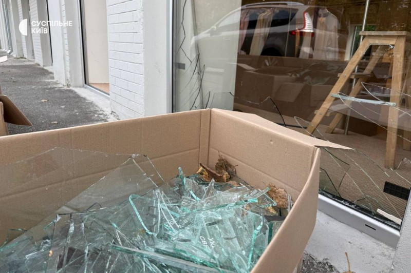 Вибите внаслідок дронової атаки РФ вікно шоуруму бренду Etnodim. Київ, 23 жовтня 2025 року. Суспільне Новини/Станіслав Свирид