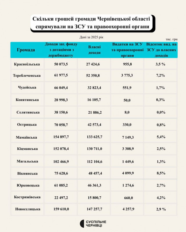 Інфографіка громад, які виділяли гроші на підтримку Сил оборони. Суспільне Чернівці
