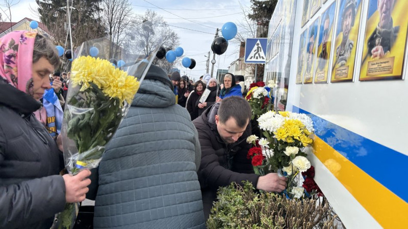 Люди кладуть квіти до банера. Суспільне Вінниця
