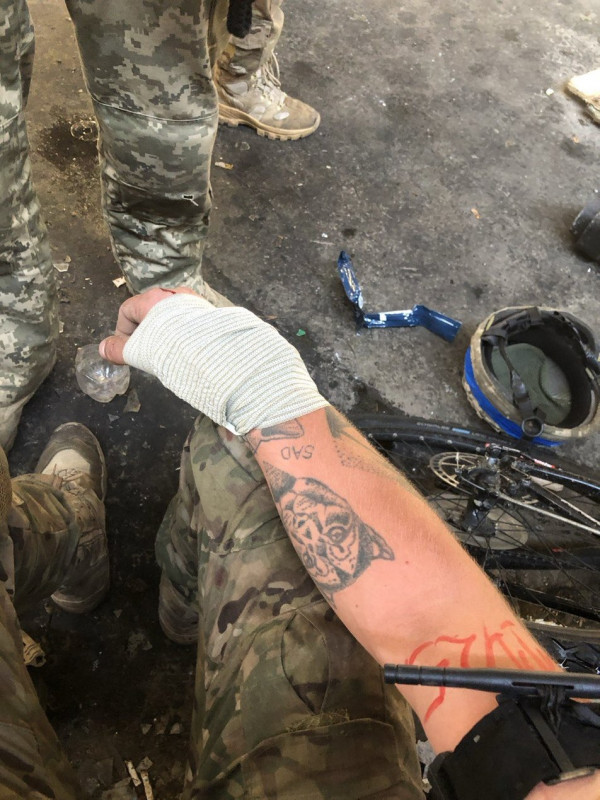 Так сталось, що ми відлежалися, доки закінчиться сам обстріл. Я піднявся перший — і пролунав вибух недалеко від нас. Я отримав осколок у руку. Зразу ж впав на тому ж самому місці, наклав турнікет, почав перевʼязувати рану. Хлопці піднялися, допомогли мені.