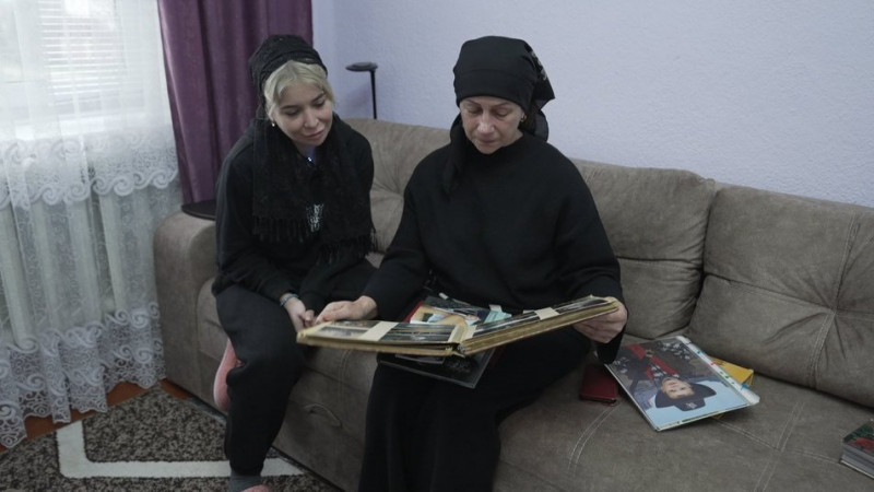Кеті та Наталія переглядають дитячі фотографії Володимира Векліча. Суспільне Вінниця/Андрій Нєстєров