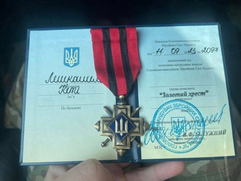 «Золотий Хрест», який медикині та снайперці присвоїв Головнокомандувач ЗСУ Залужний. Фото надала Кеті Лешкашелі"У 2023 році 24 березня була операція. Ми вийшли на бойове завдання. Нас розстріляли з танка: двоє загинули, двоє важко поранені, я і ще один хлопець залишилися. Наша позиція була за 700 метрів. Він вирішив піти туди, бо поранені стікали кров'ю і їх потрібно було швидко евакуювати. Нас почали "крити", Я відкрила гранату і тримала: а що я сама зроблю, якщо кацапи прийдуть? Я не покинула своїх хлопців і потім прийшла підмога, забрали "трьохсотих", але ми мали лишитися на позиції, щоб її не втратити. Вони пішли, і ми з одним солдатом залишилися, правий фланг самі тримали. Тому, що я дівчина, мабуть, через це мене нагородили", — розповіла Кеті Лешкашелі.
