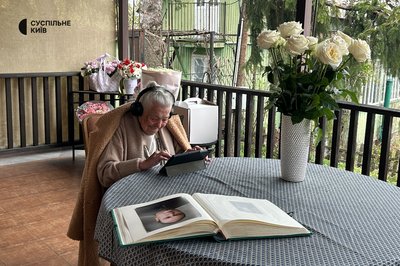 Зоя Іщук переглядає відео в планшеті. Київська область, 18 квітня 2026 року. Суспільне Новини/Анна Москаль
