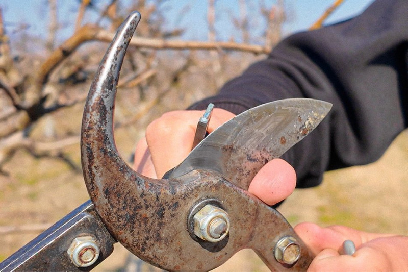 Микола показує, як заточує сучкоріз. Суспільне Чернівці/Андрій Романцов"Ставимо інструмент у зручне для нас положення. Беремо гострилку, робимо кут і починаємо гострити з одного боку, а з іншого боку підправляємо. Потім змащуємо інструмент у місцях, які передбачив виробник", – розповів Микола.