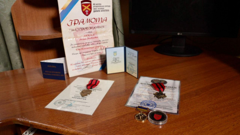 "Золотий хрест" – це за 23-й і 24-й рік . Під час контрнаступу ми займали одну з найскладніших позицій на Оріхівському напрямку, ми досить довго її утримували і ефективно працювала артилерія там. Ця нагорода дуже важлива для мене, мабуть, як і для кожного солдата. Вона не дає забувати, де ми були і що ми робили. А це "Хрест хоробрих". Ми утримували теж таку досить складну позицію. І командування так нас відзначило.
