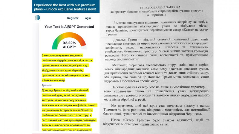 Щодо скверу на честь Трампа у Чернігові, то за словами Романової, пояснювальну записку до рішення міської ради згенерував ChatGPT. На підтвердження цієї думки вона навела скриншоти з висновком програми.
