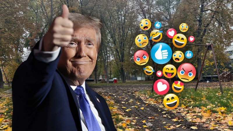 Колаж із зображенням Дональда Трампа на фоні скверу «Казка» мікрорайону Шерстянка у Чернігові та смайлики, які використовують як реакції у соцмережах. Getty Images/Cуспільне Чернігів
