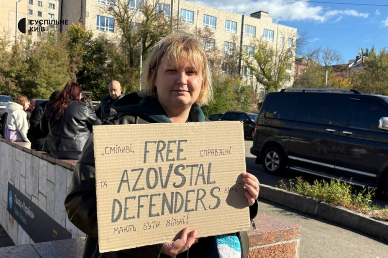 Учасники акції «Не мовчи, полон вбиває!». Київ, 12 жовтня 2025 року. Суспільне Новини/Дар’я Григоренко"Всі мають повернутися додому, всі полонені. Не важливо Азов це, чи з інших бригад. Всі мають бути вдома, як і всі донатити і підтримувати армію. Ми робимо те, що можемо зробити тут і зараз. Вийти на акцію в неділю — нічого не коштує", — каже Наталія, яка більше роки щонеділі виходить на акції в підтримку полонених та зниклих безвісти.
