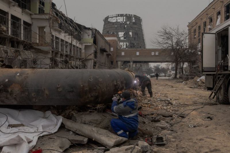 Робітники працюють над ліквідацією наслідків російського удару по Дарницькій ТЕЦ. Київ, 4 лютого 2026 року. AP/Sergei Grits