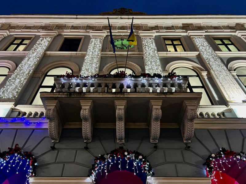 Балкон Чернівецької міської ради, прикрашений до новорічних свят. Суспільне Чернівці