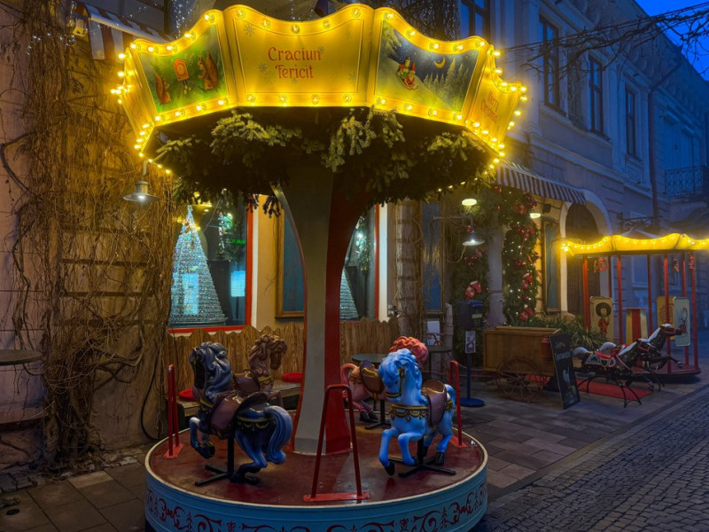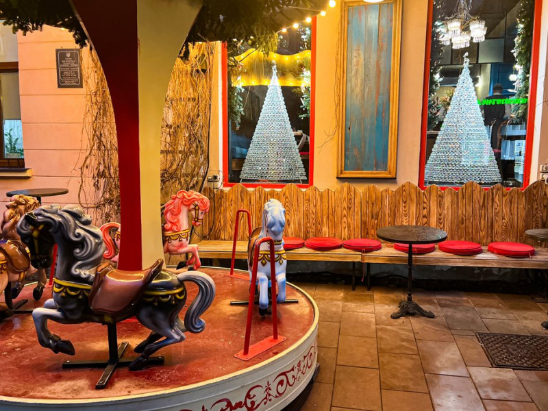 Новорічний декор закладу поблизу каруселі. Суспільне Чернівці