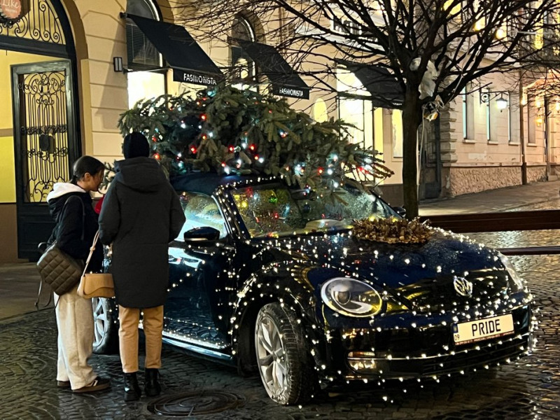 Автомобіль на вулиці Кобилянської, прикрашений новорічними гірляндами та ялинкою. Суспільне Чернівці