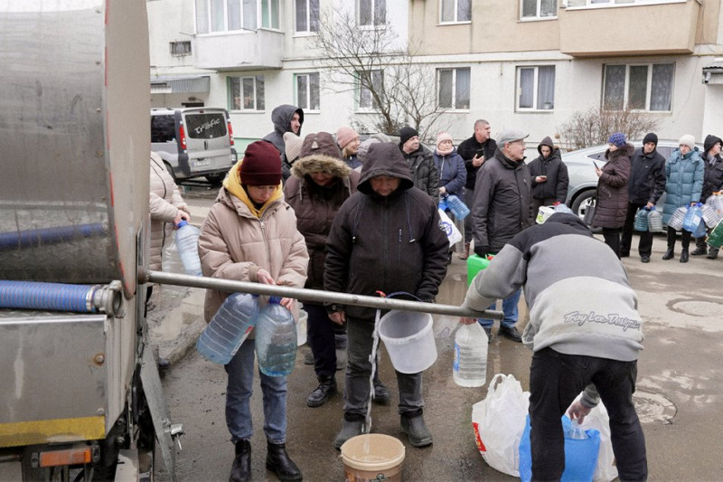 Люди набирають воду, яку їм підвозять через аварію на каналізаційному колекторі у Чернівцях, 2 березня 2026 року. Суспільне Чернівці
