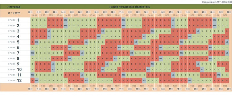 Графік погодинних відключень електрики на 12 листопада 2025 року у Чернівцях. АТ «Чернівціобленерго»