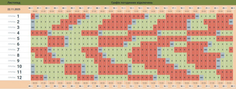 Графік погодинних відключень електрики на 22 листопада 2025 року у Чернівцях. АТ «Чернівціобленерго»