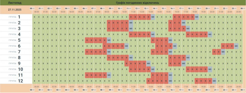 Графік погодинних відключень електрики на 27 листопада 2025 року у Чернівцях. АТ «Чернівціобленерго»