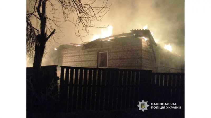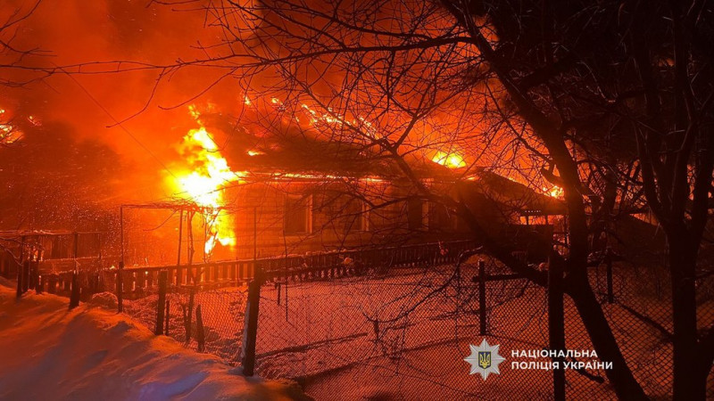 Горить будинок внаслідок атаки РФ по Новгороду-Сіверському на Чернігівщині вночі 9 лютого 2026 року. Поліція Чернігівської області