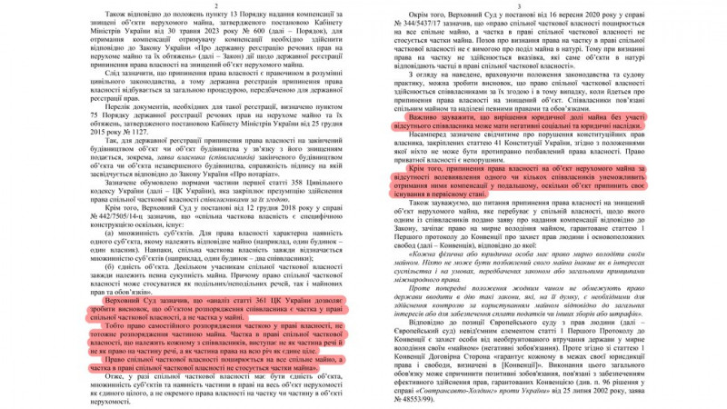 Згідно з відповіддю від 2 грудня, яку Мінрозвитку надало нардепу, з 5 січня 2026 року набуває чинності постанова, що спрощує процедуру отримання компенсації за програмою "єВідновлення" для пошкодженого житла, що перебуває у спільній власності. Що ж до знищенного житла, то тут Міністерство розвитку посилається на лист Мін'юсту від 8 жовтня 2025 року, де роз'яснюється одна із вимог щодо припинення права власності на знищений об’єкт нерухомості, яка у випадку відсутності одного зі співвласників може порушити чинне законодавство.